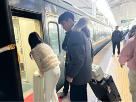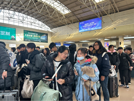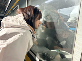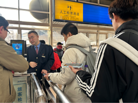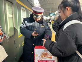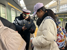 随着检票的开始,学生们陆续登上火车,辅导员们在车窗前拍下同学们乐观的笑容。火车开启后导员们挥手微笑送别,传递着期待与关爱。