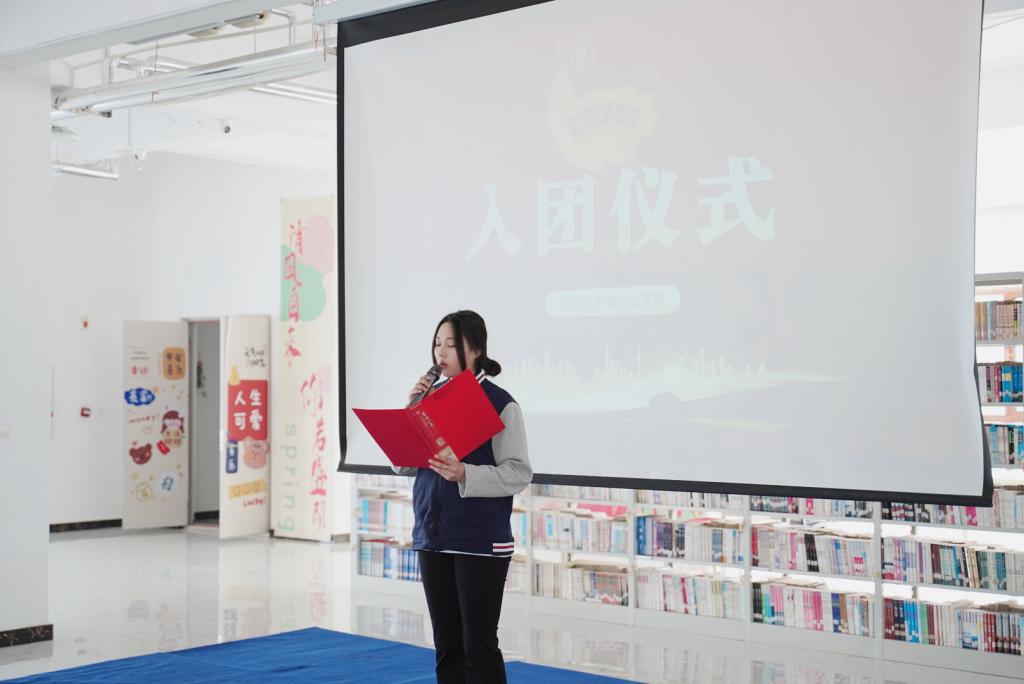 仪式在庄严的《中华人民共和国国歌》中正式开始,全体人员起立,面向国旗行注目礼。雄壮的歌声响彻全场,激发了同学们的爱国爱党热情。主持人赵宇欣郑重宣读本次新发展团员名单。随着名字被依次念出,台下响起热烈持久的掌声,既是祝贺,也是期许。新团员们神情庄重,脸上洋溢着自豪与喜悦,目光坚定明亮,青春的朝气与荣光在这一刻尽情绽放。