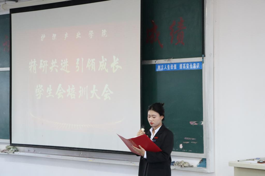 培训会议开始,由护理产业学院学生会副主席赵佳怡介绍出席嘉宾,护理产业学院团总支书记梁陆宇,护理产业学院学生会各部门部长及其副部。