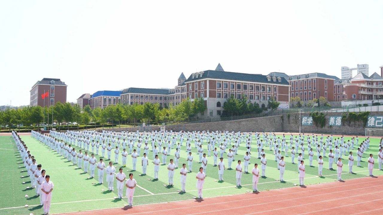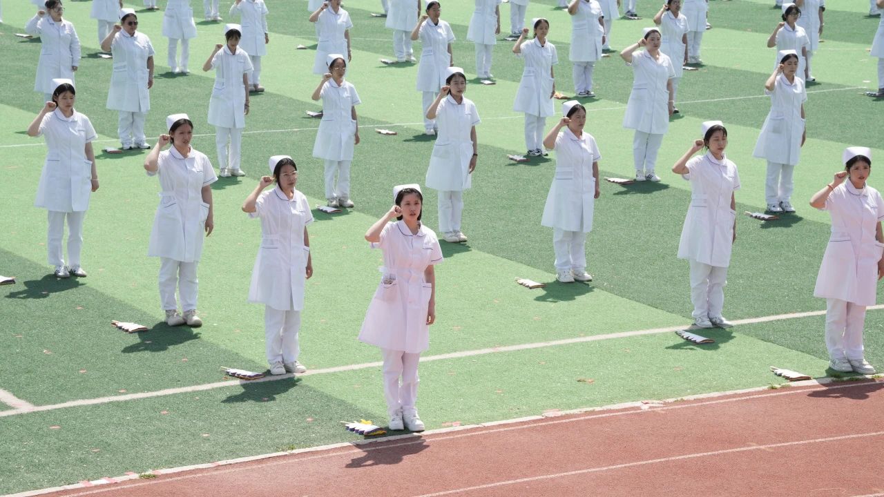 “我宣誓:以真心、爱心、责任心对待每一位病人,精益求精、坚定信念、忠于职守……”全体护理学生庄严宣誓,洪亮的誓言回荡在操场上空。