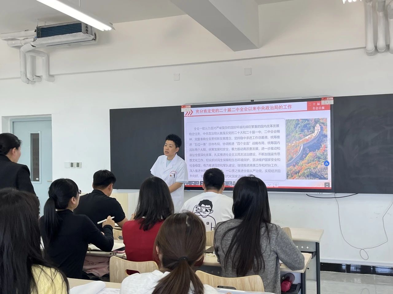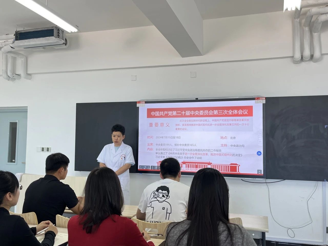 在讲解过程中,王珊书记结合护理产业的实际情况,深入阐述了如何将会议精神贯彻到学院的各项工作中。她指出,护理专业作为关乎人民健康的重要领域,要紧密围绕全会提出的“以人民为中心”的发展思想,不断提升护理教育质量,培养出更多具有高尚医德、精湛医术和强烈社会责任感的护理人才。同时,要加强科研创新,推动护理产业的现代化发展,为健康中国建设贡献力量。