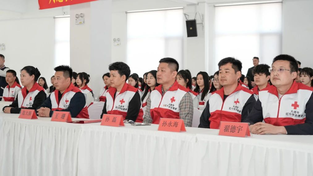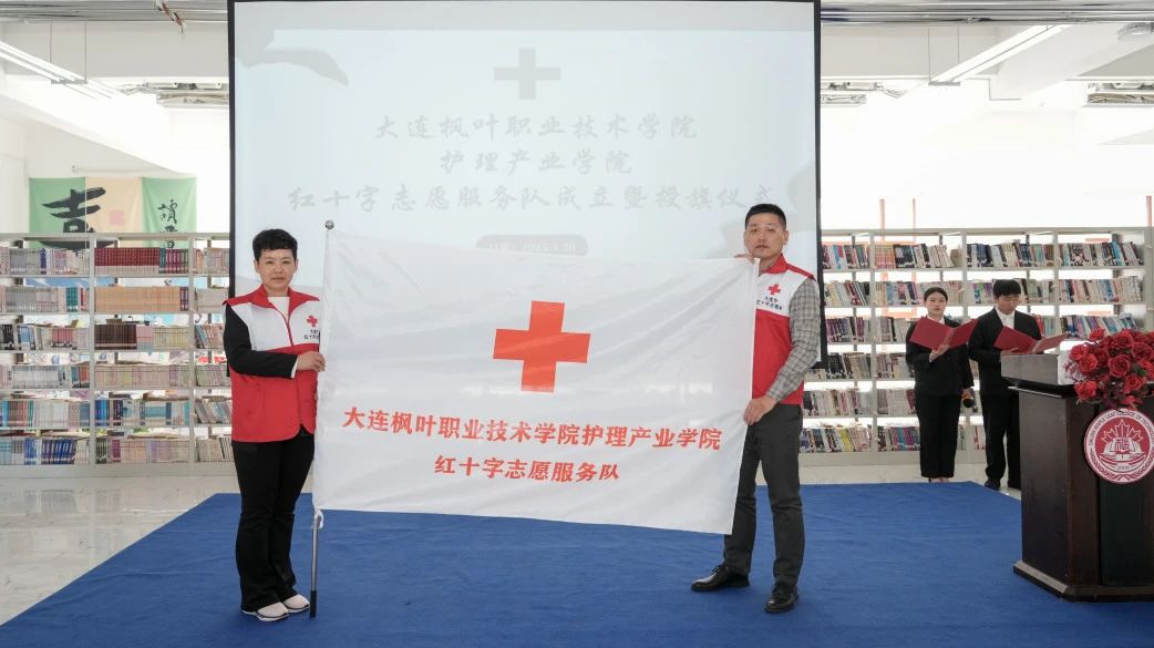 在授旗仪式上,大连市红十字会宣传部志愿服务队负责人孙磊为“大连枫叶职业技术学院护理产业学院红十字志愿服务队”授旗,“大连市最美退役军人”“大连好人”范大振带领百余名学生志愿者庄严宣誓。该队伍将聚焦社区服务、赛事保障、校园急救等场景,以专业能力践行“人道、博爱、奉献”的红十字精神。负责人表示,高校志愿力量的加入,将为大连市公益服务注入青春动能,推动“人人学急救、急救为人人”的社会风尚形成。护理产业学院党支部书记、院长王珊,护理产业学院学生副院长孙永海,护理产业学院教学副院长翟德宇、护理产业学院团总支书记梁陆宇出席仪式,共同见证志愿服务力量的集结。